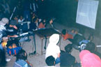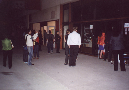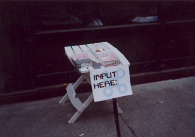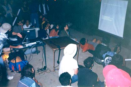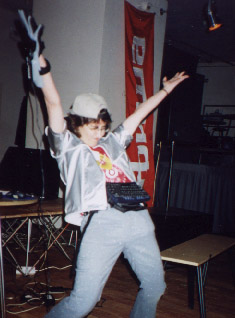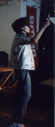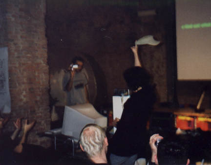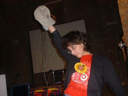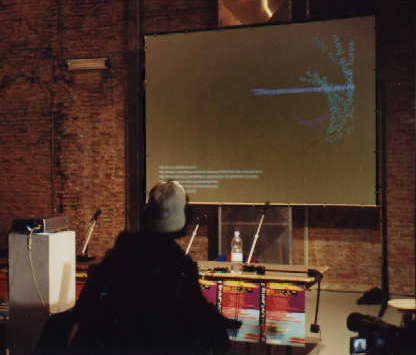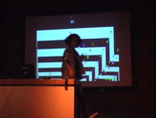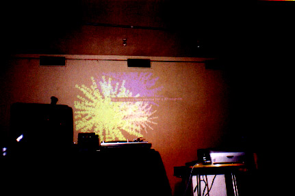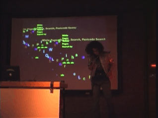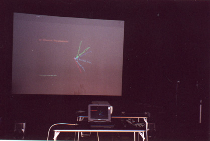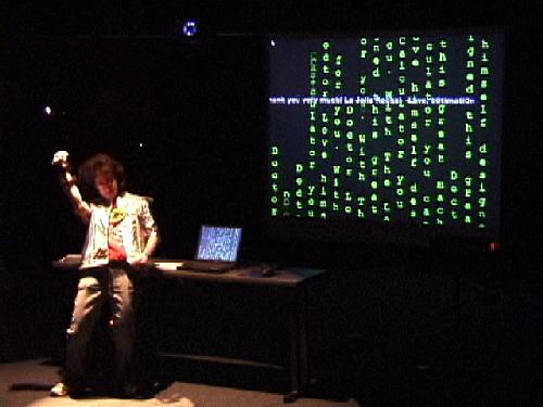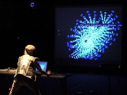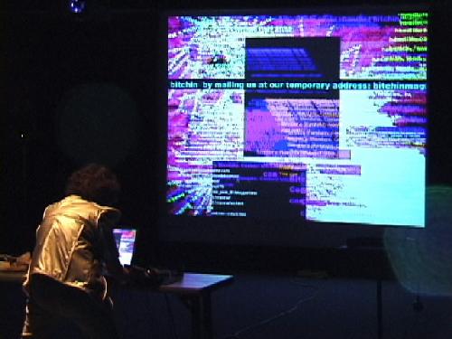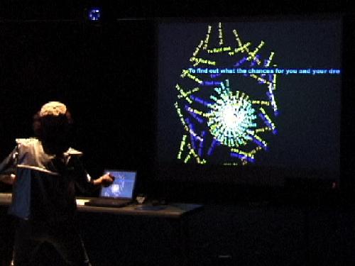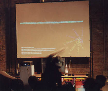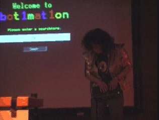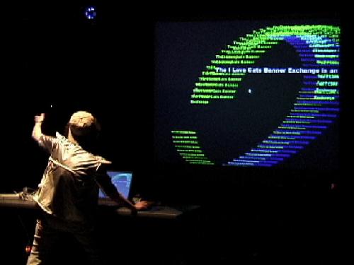 b0timati0n was an early performance by Übergeek. Performed from 2000-2003, b0timati0n used more limited graphics and non-narrative searches. Performances were generally short (8 - 20 minutes) and scripted. b0timati0n was typically performed at art festivals in North America and Europe. In mid-2003, owing to her desire to expand the visuals and perform for a broader range of audiences, Übergeek decided to transform b0timati0n into a club VJ performance. The new performance, CyberSpaceLand, incorporates more complex visuals and search narrative. Since CyberSpaceLand is designed for longer sets performed with musicians and DJ's, the structure takes a more improvisational form.